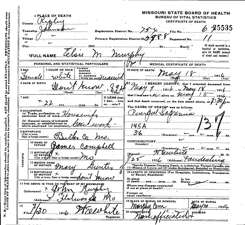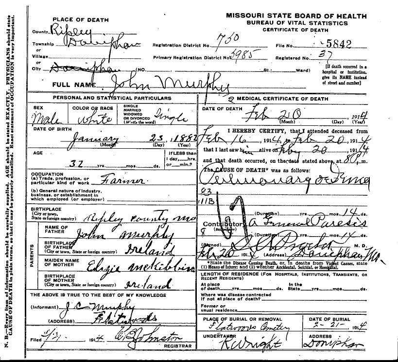 Cert.#25535. Informant John Murphy. Born in Butler Co MO; burial May