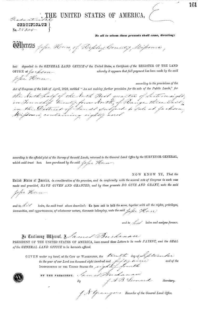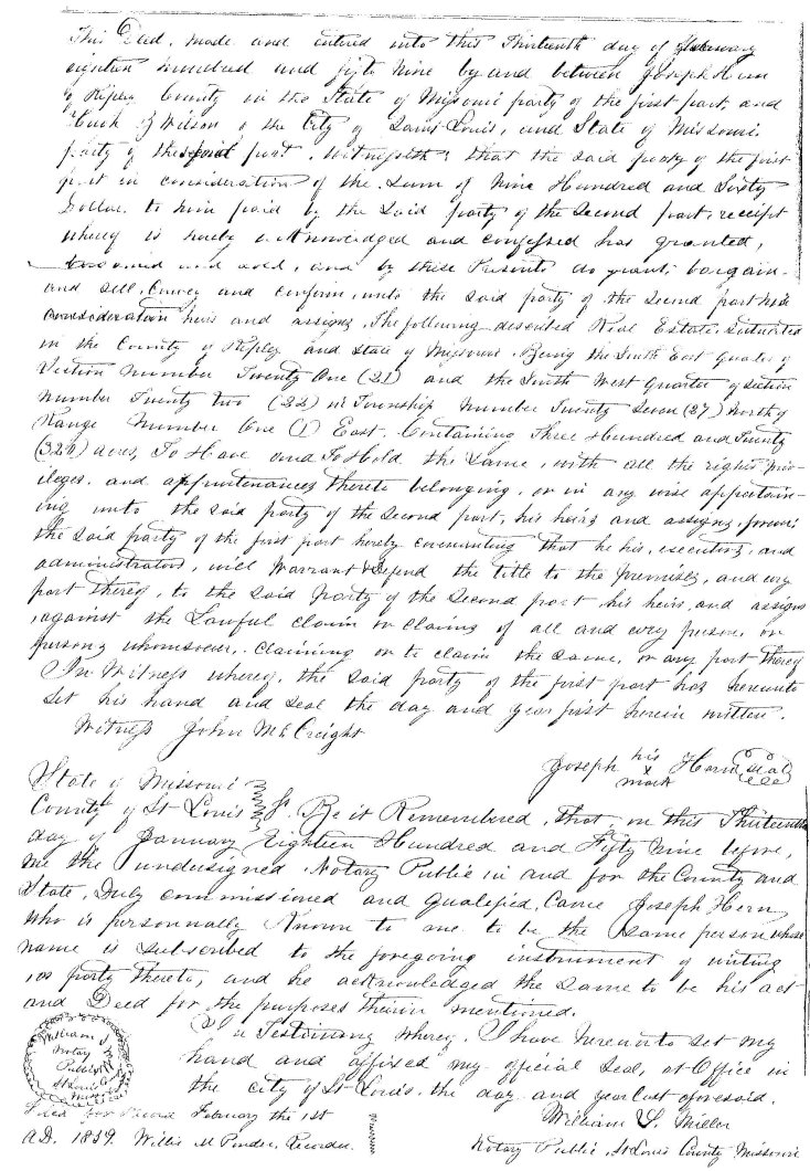 | JESSE HORN BIOGRAPHY 1783: Born in PA 1790: 1800: 1810: N.C., Orange County census - Jesse, 1 M (16-26), 1 F (under 10), 1 F (16-26). Listed on the same page are James Horn Sr. (45+), whom I believe is Jesse's father; Joshua Horn (over 45), Joseph Sr. Horn (26-45), William (26-45). I believe that Joshua, Joseph and William are brothers of Jesse. On this same census are Gilliam, Glenn, Jamison and Love, all families that later married into the Horn family. The William Horn (26-45) could be the William Horn, b 1768 in NC that was the father of Harmon, then Howell, Christopher Columbus (who is buried in Yellville, AR), then Andrew Johnson. That would explain the parallel travels of Harmon and Jesse through AL, TN, IL, MO and AR. 1815: son John was born in Tennessee 1817: son Frederick, b Tennessee 1819/1820: son Jacob b Alabama 1820: Where is Jesse this year? Alabama, I think, but only a portion of that census is available. Could be Tennessee. 1825: daughter Catherine b. Tennessee 1829: son Jesse b Tennessee 1830: IL, Montgomery Co., Westfork Twn., Jesse Horn, 2 M (under 5), 2 M (5-10), 1M (30-40); 1 F (under 5)1 F (under 10), 1 F (30-40). (The female listed as under 10 in the 1810 Census does not show up on this census, so assume she is dead.) 1831: daughter Charity b Illinois 1834: son Joseph b Missouri 1836: daughter Charlotte b Missouri 1837: son David b Missouri 1840 AR, Izzard Co., White River Twp: Males - (under 5), one; 1-5, one; 5-10, one; 10-15, one (Joseph); 15-20, two; 50-60, one. Females - under 5, one; 10-15, one; 15-20, one; 40-50, one. 1850 MO., Ripley Co., Dist 55: Jesse, 67, b. PA., farming; Jesse, 21, b. MO., farming; Crey J (I believe this should have been "Charity", 18, b. Illinois; Joseph, 16, b. MO, farming; Charlotte, 14, b. MO.; David, 13, b. MO., Wm., 10, b. AR. (James, born in Alabama, and John Horn also were listed as heads of house on this same Census. They could have been the two males between 15 and 20 listed on the 1840 Census. Jacob Horn, born in Alabama, could have been an older son who was already gone by the time the 1840 Census was taken. Jacob had a son in 1843 in Missouri.) February, 1859: Two sons, Joseph and Jesse, bought and sold land in Ripley Co., MO. Believed to be land inherited at their father's death. (The probate court clerk for Ripley County wrote that she did not find a will for him.) The land that went to Jesse and Joseph Horn is documented below. |